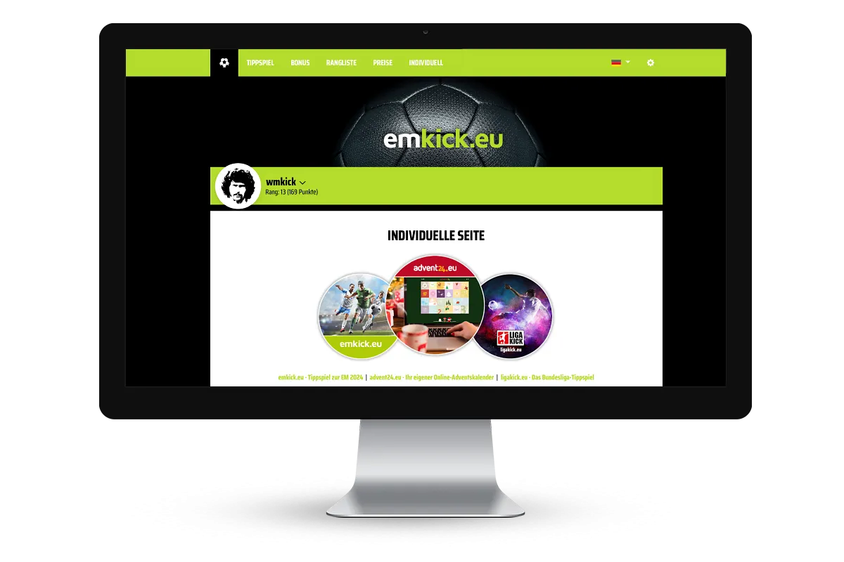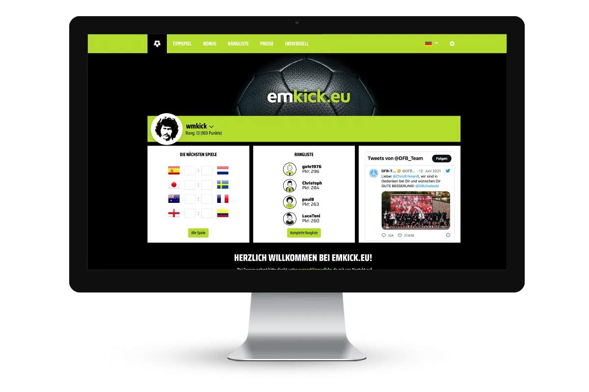 emkick.eu offers customised online betting games for the European Football Championship (EURO). Ideal for companies, clubs and groups of friends who want to organise their own European Championship betting pool. Numerous functions, customised design options, language options and various additional features have made us one of the most popular providers in the German-speaking world since 2002.